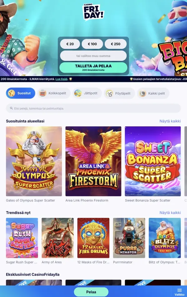 Mobiilissa saat saman ydinkasinosisällön kuin tietokoneella: Friday-kolikkopelit, live-jakajan pöydät, jättipotit ja klassiset pöytäpelit. Jos etsit vedonlyöntiä, haluamme olla selkeitä: keskitymme kasinopelihin emmekä tarjoa vedonlyöntiä tällä hetkellä.